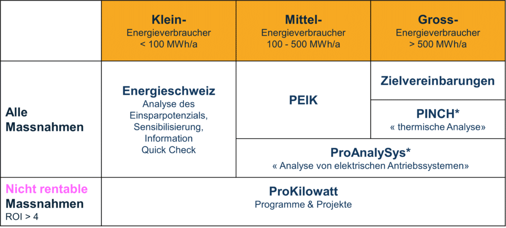 Die PINCH-Analyse ist für jedes Produktionsunternehmen geeignet, das Wärmeenergie benötigt und Energiekosten von mehr als 300’000 Franken im aufweist. Die Analyse zeigt auf, wo in einem Unternehmen unnötig Wärme verloren geht. Es müssen daraufhin nur noch Effizienzmassnahmen durchgeführt werden, die sich schnell auszahlen. Das Bundesamt für Energie (BFE) unterstützt die Voranalyse des Einsparpotenzials mit bis zu 60%. Es deckt auch bis zu 40% der Kosten der PINCH-Analyse.