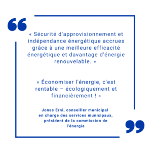 Nous analysons actuellement la situation d’une pénurie d’énergie en hiver. Wädenswil compte environ 14 installations à grande consommation susceptibles d’être concernées par un éventuel contingentement de l’électricité. Parmi celles-ci, on trouve des écoles, des maisons de retraite, des bâtiments administratifs et une station d’épuration. Nous examinons le potentiel de mesures de contingentement, mais aussi d’optimisations générales de l’exploitation de ces installations. Cette analyse mettra peut-être à jour de nouvelles mesures d’efficacité électrique que nous regrouperons alors dans une nouvelle demande de projet ProKilowatt.