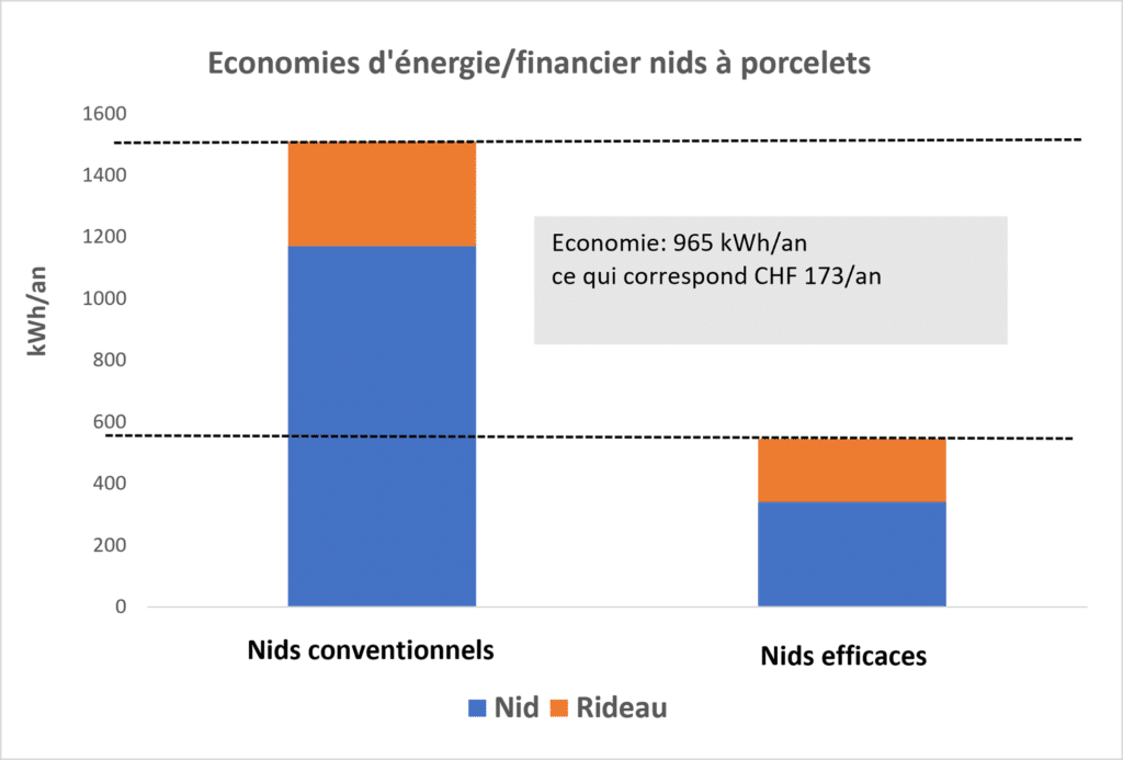 En moyenne, une porcherie a 10 nids à porcelets et économise environ 10’000 kWh électrique par année (2’000 CHF/an) avec l’installation de tels nids. Le potentiel d’économies est important étant donné que la Suisse compte environ 2’200 porcheries d’élevage.